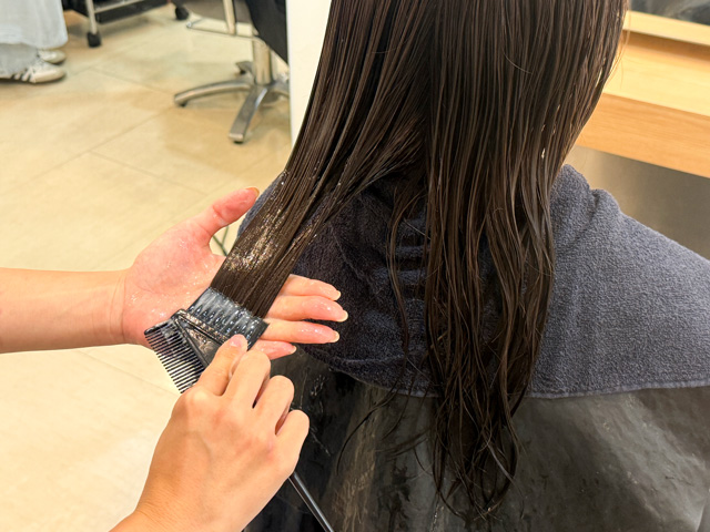 4種類の薬剤を塗布し、ダメージを受けてアルカリ性に傾いた髪を弱酸性へ。キューティクルを整えて髪の栄養が抜けない綺麗なツヤ髪を作り出します。
