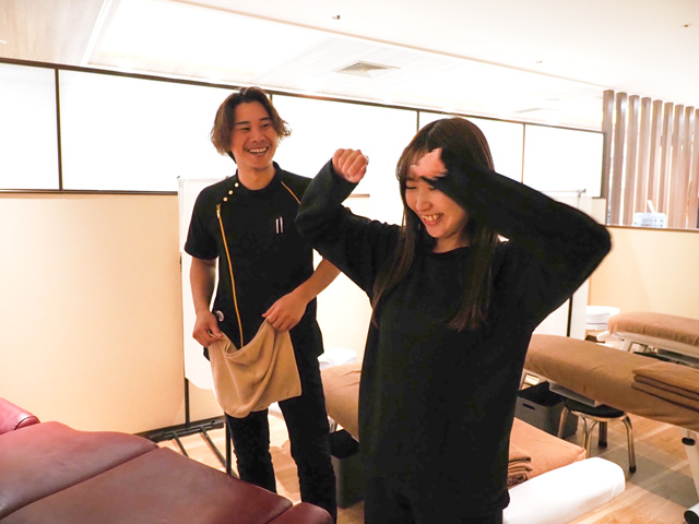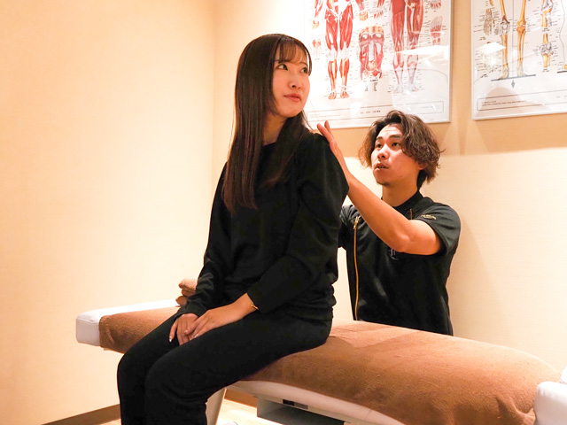 体の状態が理解できたところで、いよいよ施術のスタート。首周りや骨盤周りなど、一人ひとりに合わせた力加減や分量でより良いボディバランスへと調整します。