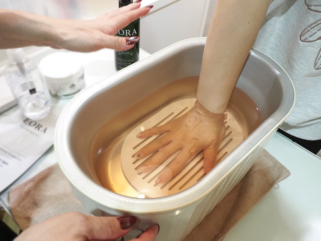 2回ほど浸けて固まったら、手袋をかぶせて保湿。じんわり温かく、ほわ〜っと癒やされて眠たくなる感覚です。パラフィンをオフするとつるんっと蘇ったような手先が現れ、優れた保湿力も実感できます。パラフィンパックは、先にご紹介したハンドスパの保湿パックからプラス550円で変更も可能。より贅沢なハンドケアを体験してみては。