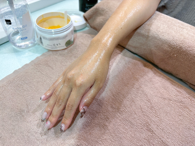 乾燥でカサカサしがちな年末年始こそ、ハンドケアでつるんとした指先を叶えましょう!50分のハンドスパでは、まず手から肘あたりまでオイルでしっかりマッサージ。