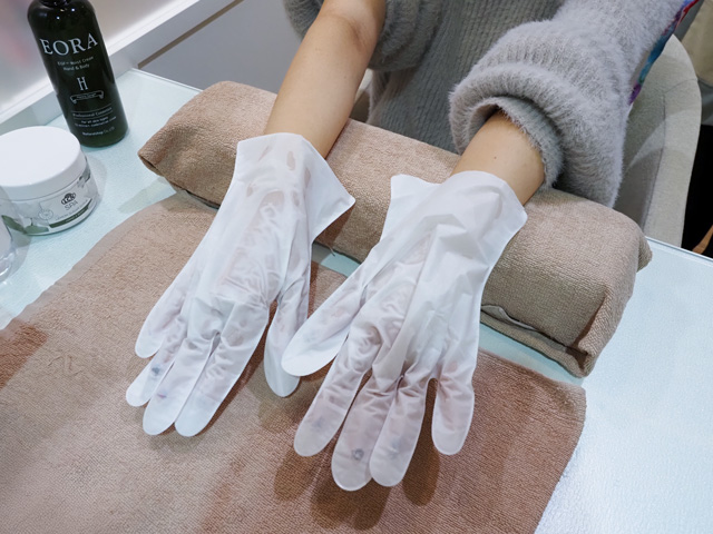 さらに専用の保湿パックを装着して、10分間しっかり馴染ませます。美容液がたっぷり入ったパックなので、オフした後は肘ぐらいまで伸ばして浸透させると◎。マッサージと保湿で乾燥ケアと癒やしをゲット。日頃の疲れも吹き飛びます♪