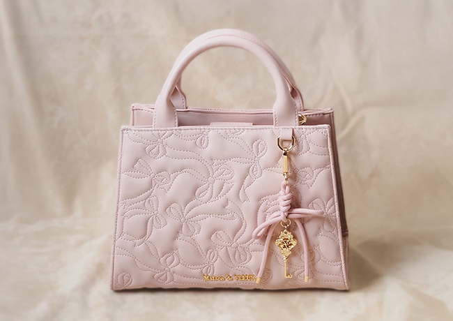 リボン柄のキルティングが上品さを引き立てるミニトートバッグ。リボン×鍵モチーフのチャームをあしらい、トレンド感たっぷりなデザインです。コンパクトなスクエアフォルムながら、500mlのペットボトルがすっきり収まる収納力も魅力。