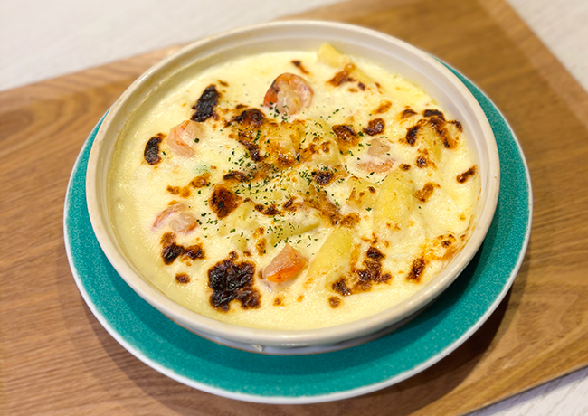 シーフードとまろやかなソースがからみ合うグラタンです。ソースには濃厚な北海道牛乳を使用し、コク深くクリーミーな味わいに。とろけるチーズとホワイトソースが重なり合い、ひと口ごとに幸せな気分をお楽しみいただけます。