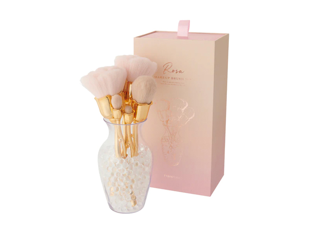 バラのブーケを思わせるデザインのメイクブラシセット♪使っていない時も花瓶のようにお部屋に映える、クリアビーズのブラシスタンド付き。フェイスブラシ、チークブラシ、アイシャドウブラシ(3本)が揃います。