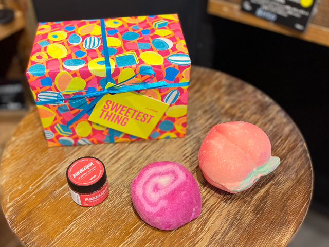 バスボムとバブルバー(泡風呂入浴料)、そしてリップスクラブがセットになった人気のギフト♪ピンクカラーをセレクトしたセットで、もらっただけで気分が明るくなるアイテム。ラッピングがエシカル素材なところもラッシュらしいポイント!