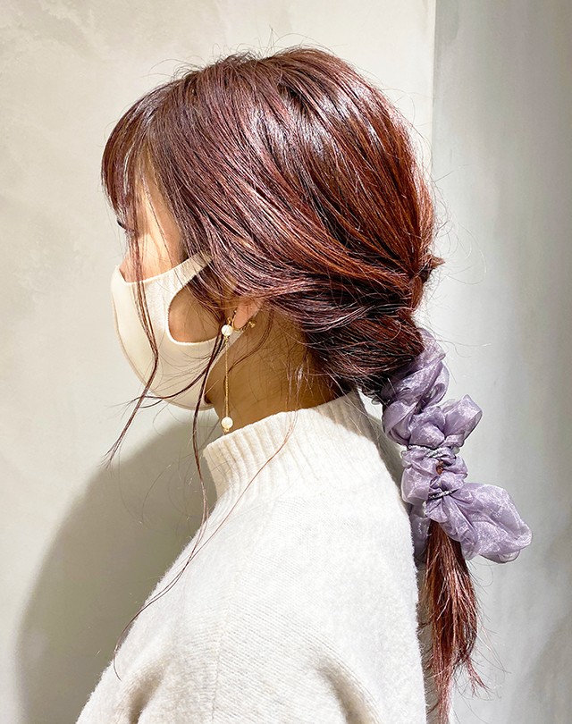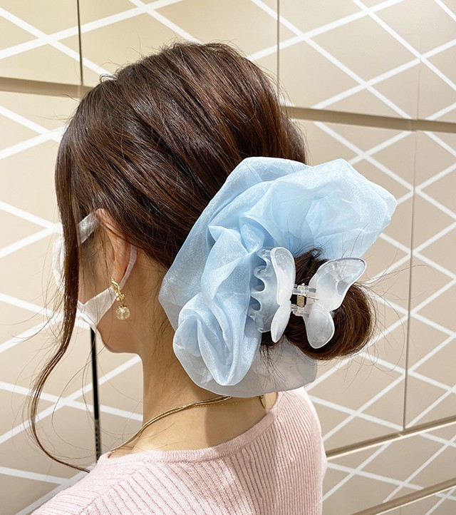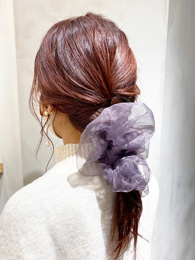 ヘアアレンジに使用したのは、こちらのやわらかなふんわりカラーと透け感のある生地がかわいいオーガンジーシュシュ。大きめのデザインで、ラフなポニーテールに巻きつけるだけでもトレンド感をアップしてくれます。シンプルな無地デザインなので、お手持ちのヘアアクセと組み合わせても◎。ナチュラルなワンピースや明るめのブラウスなどのコーデにぴったり。フェミニンなファッション好きの方におすすめ。落ち着いたカラー展開もあるので、オフの日はもちろんオフィスでも使えます。