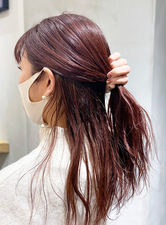 2.左右から毛束を取りながら編み込んでいき、首の後ろあたりまで三つ編みがきたらヘアゴムで結びローポニーに。サイドの髪は少し残しておくと、こなれ感がアップします!