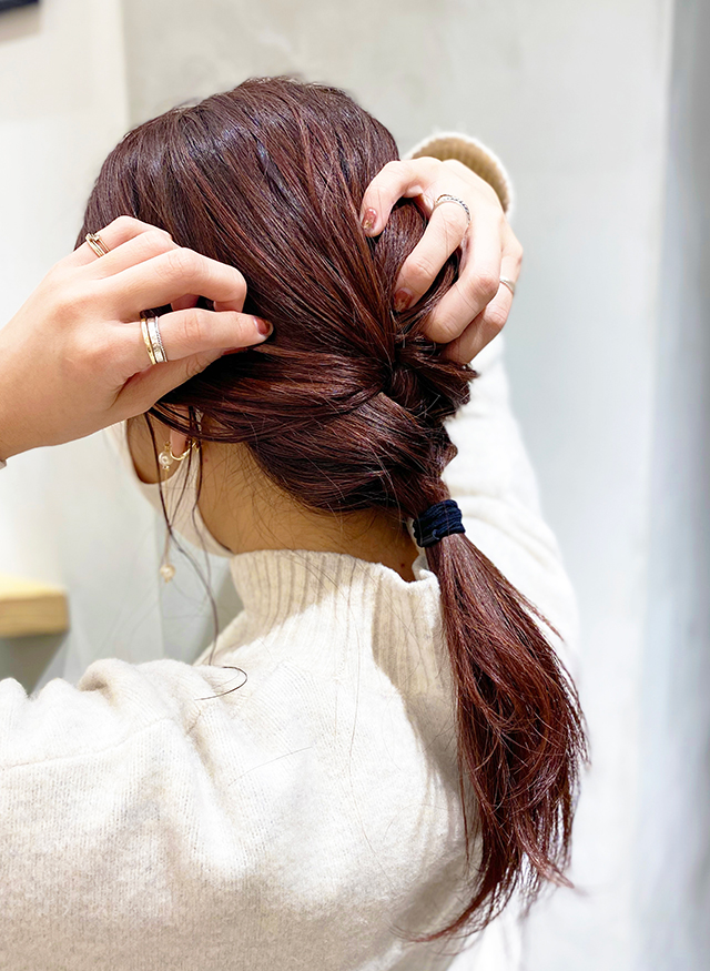 2.ヘアゴムの上の毛を少し引き抜き、トップをゆるく整え、残った髪を2つに分けてねじるように編んでいきます。
