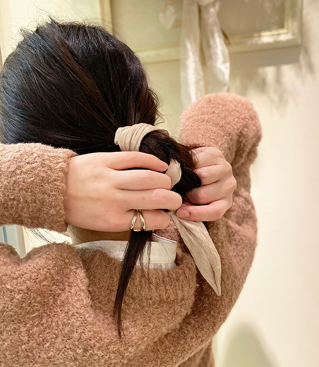 ヘアアレンジに使用したのは、こちらの優しいコットンのような素材のシュシュ。細かく入ったシボの質感が程よくカジュアル感を演出してくれ、お出かけの日もお仕事の日も、デイリーにも使える便利なヘアアクセです。キラッと光るゴールドのチャームがアクセント。使いやすい定番カラーから季節感のあるトレンドカラーまで、全5色のカラーバリエーションを展開中。