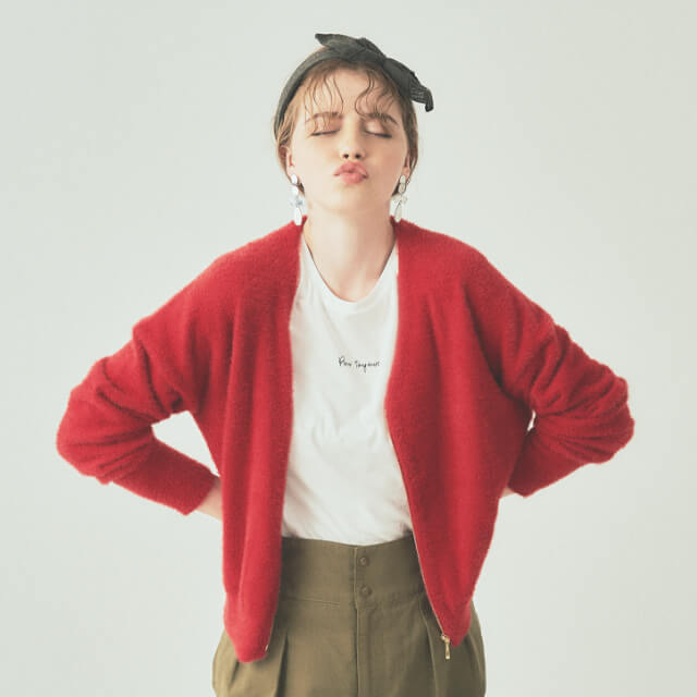 毎年人気のジップファスナー付きのフェザーカーディガン。定番の秋色ブラウンやカーキと相性が良い、天王寺ミオ限定色のレッドカラーです。フェザーのようなフワフワした風合いの素材はナイロン100%。チクチクしないなめらかな肌触りで、お手入れも自宅で簡単。重くなりすぎないコンパクトな着丈で、スカートやワイドボトムとのコーデにもぴったり。少し肌寒い秋には主役の羽織として、冬はコートのインナーにプラスする差し色として。秋冬コーデに大活躍です。