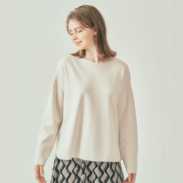 大人気の洗濯機で洗えるニット。ハーフミラノ編みで、程よい落ち感と適度な厚み、柔らかさのある質感がポイントです。肌馴染みの良いオフホワイトカラーは、チェック柄や幾何学柄など秋柄との組み合わせがおすすめ。すっきりとしたテーパードパンツにも合わせやすく、オフィスシーンでも活躍します。この秋何かと重宝するシンプル&エレガントなニット。エコ素材のエコヴェロレーヨンを使用した環境にも優しい1枚です。