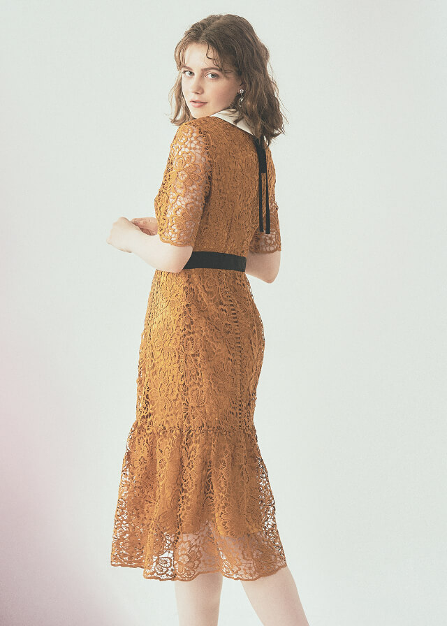 深みのある紅葉のようなイエローカラー。袖と裾だけさりげない肌見せができる、品の良い透け感を実現したレースがポイントです。ウエスト切り替えデザインが、バランスの良いスタイルを演出。ボトムの甘いフレアシルエットにはハシゴレースを取り入れ、大人っぽい印象に仕上げています。アクセントになる首元の黒リボンは、シーンに合わせて着脱可能。普段使いにも、オケージョンにもおすすめです。