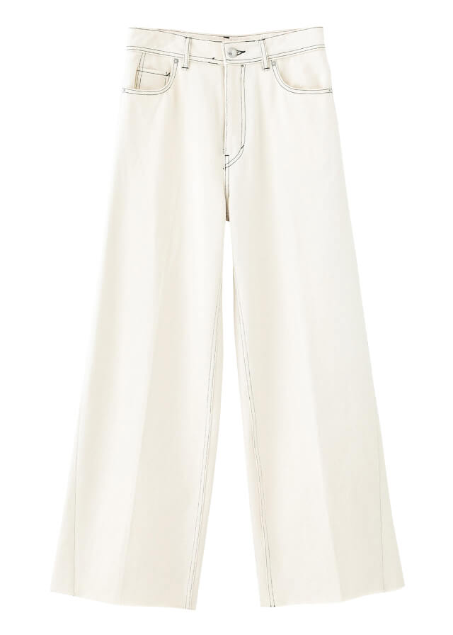 配色ステッチが効いたホワイトカラーのワイドデニム。トレンチコートやロング丈の羽織のコーデにぴったり。着こなしやすいクリーンなカラーなので、ワイドパンツに挑戦したことがない人でも安心。ノータックで腰回りに心地よくフィット。裾の断ち切りが今っぽいデザインで、ワイドだけどすっきりとしたシルエットで脚長効果もあります。岡山で作られた高級デニムを使用した、しなやかでしっかりとした生地感も魅力。秋だけじゃなく、1年中楽しめるデニムです。