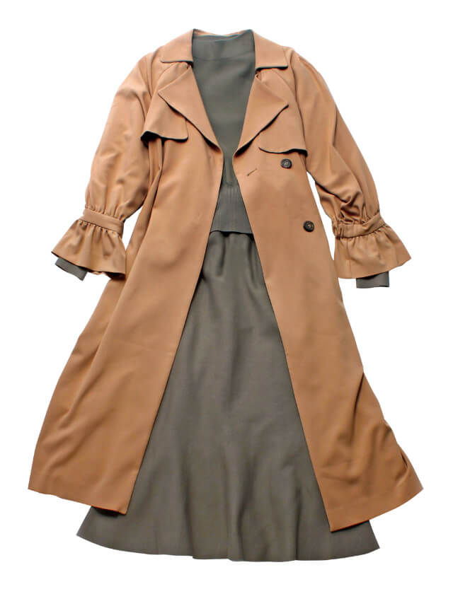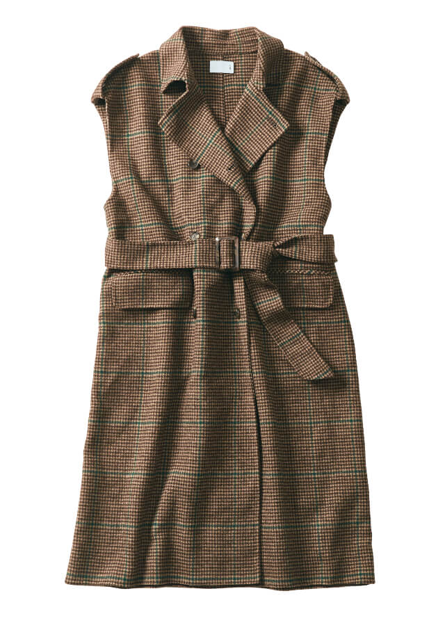 この1枚を着るだけで、一気に秋らしい着こなしに仕上がるトレンチ風のロングジレ。前を閉じてワンピース風に着こなせばシックな雰囲気に。同布ベルトでウエストマークすればスタイルアップ効果も。前を開けてサッと羽織れば、スタイリッシュにも変化します。無駄な装飾を省き、秋らしいヴィンテージスタイルを際立たせたデザインが光る1着です。