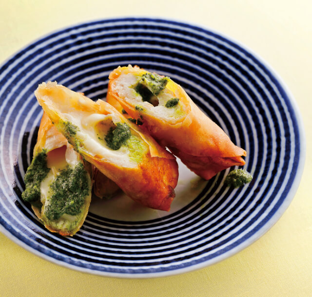 焼鳥とワイン カッシーワは、焼き鳥と季節のワインが楽しめるグルメでおしゃれな“ネオ酒場”。こちらのメニュー「ささみとチーズの春巻き」は、ヘルシーなささみと、とろ~りチーズがベストマッチ!香り高く食欲そそるバジルソースとご一緒にどうぞ。天王寺ミオ店だけの限定メニューです。