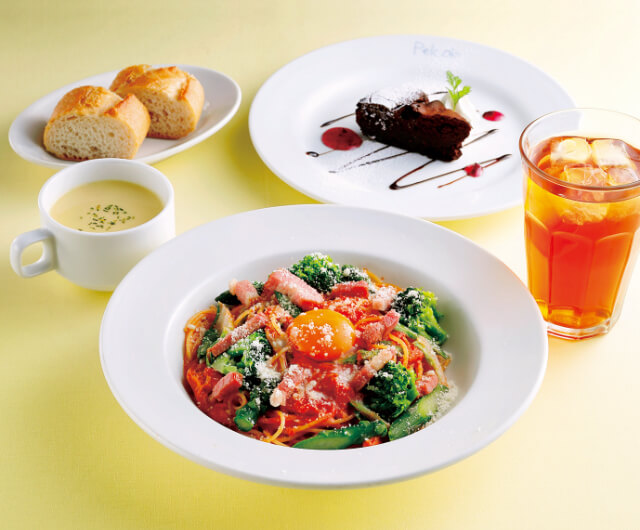 和洋折衷を織り交ぜた本格パスタが味わえるペルコラ。天王寺ミオ限定の「春のレディースセット」は、ホタルイカや桜海老、春野菜などを使用した選べるパスタと、スープ、パン、デザート、ドリンクが付いてとってもお得。パスタはプラス330円で生パスタに変更OK!グルメにこだわりありな人におすすめです。