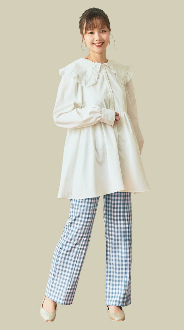 きもの やまとの着物の小紋“柄”から、アラマンダのボトムスのギンガムチェック“柄”にバトンが繋がりました。センターシームパンツで今っぽいデザイン。2021年春のトレンド、ビッグ衿のブラウスは、ヒップラインがカバーできるチュニック丈。襟をトップスとレイヤードしたり、ワンピースっぽく着たりと着回し力も抜群。ショップスタッフのお気に入りポイントはカジュアルになりすぎないきちんと感。トレンド好きな方や甘めコーデが好きな方におすすめです。