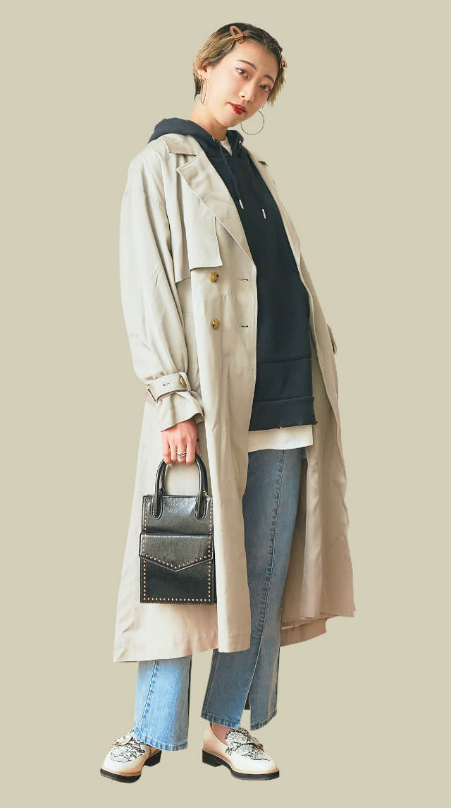 次のバトンは、レトロガール ギャラリーの“ジャケット”から、アウター繋がりでページボーイの“コート”に。春の定番アイテムのトレンチコートを使った、ページボーイらしいモード系コーデ。抜け感の出るクレイカラーのコートをメインに据え、パーカーでカジュアルダウンさせて周りと差をつけて。トレンチコートに使用したリヨセルは柔らかな生地感が特徴。ゆったりとしたシルエットで中に着込みやすいのもポイントです。モデルを務めたショップスタッフのお気に入りポイントは、高身長をスタイリッシュに見せるトレンチコートのひざ下の丈感。トップスをウエストインしても全体がバランス良く仕上がるのでおすすめです。