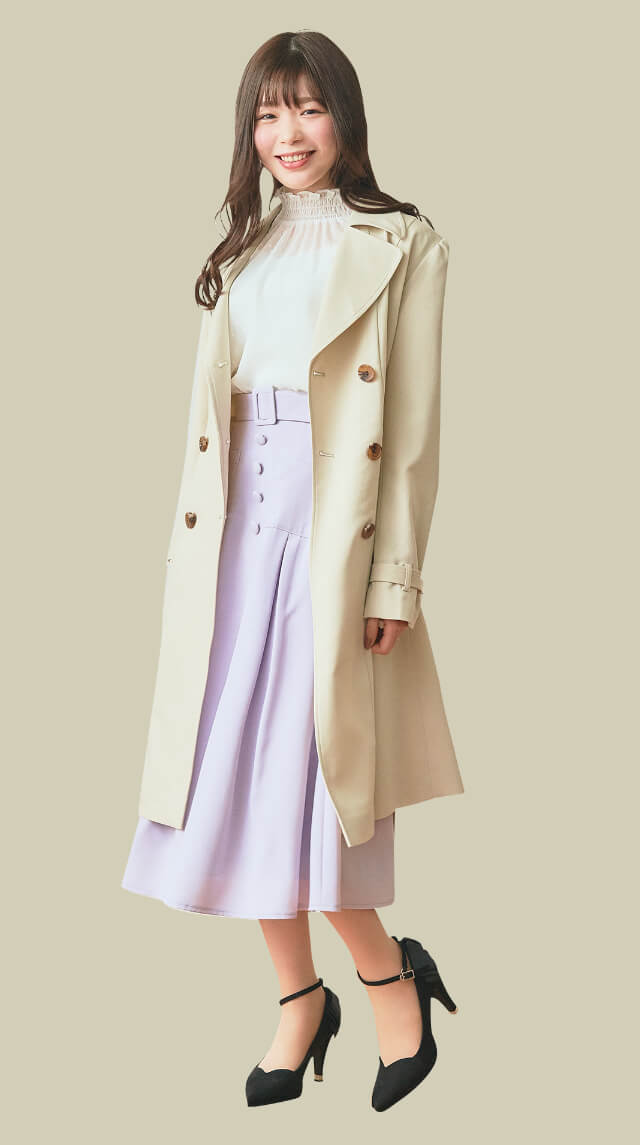 ページボーイの“トレンチコート”から、ミッシュマッシュの“トレンチコート”へバトンが繋がります。地柄ドットが華やかなブラウスとスプリングラベンダーのスカートに、トレンチコートを合わせた春らしいコーデは、誰からも好印象間違いなし。ブラウスはオンオフ問わず使える優秀アイテムです。スカートはヒップラインがきれいに見え、女性らしさを演出。トレンチコートはシルエットが美しく、羽織るだけでスタイルアップが叶います。スカートのラベンダーカラーは春らしさたっぷりでショップスタッフもお気に入り。ブラウスとスカートはセットで天王寺ミオ店だけのスペシャルプライスでお得にゲットできます。