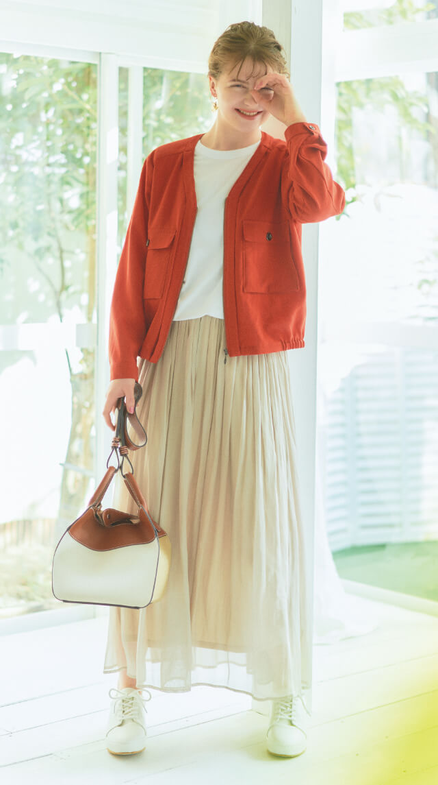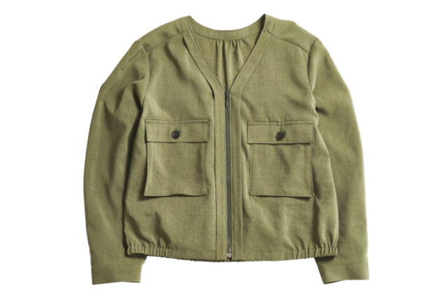 Vネックのジップタイプですっきり見えが叶うノーカラーブルゾンは、天王寺ミオ店でしか手に入らない限定アイテム。鮮やかなテラコッタカラーが明るく元気なイメージをプラスしてくれます。カジュアルすぎないシンプルなデザインで、オフィスでも着やすく、コーデ次第で雰囲気がガラリと変わるのも嬉しいポイント。カーキ色も展開。