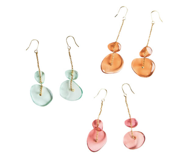 花びらのようなぷっくり透明感のあるモチーフがゆらゆらと揺れ、女性らしさを演出してくれるピアス。ツヤ感のあるきれいな印象ながら、抜け感も兼ね備えたオンオフどちらにも使えるデザイン。シャツなどのオフィススタイルから、オフの日のカジュアルファッションまで幅広く合います。カラーは耳もとから春を感じられる3色展開。