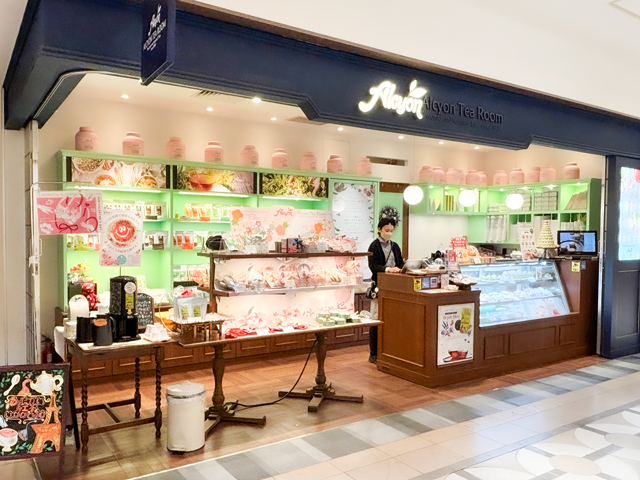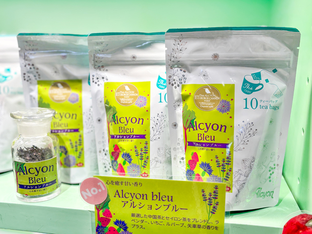フランスの有名老舗紅茶ブランド、ジョルジュ・キャノンから仕入れた紅茶をはじめ、紅茶にぴったりなフランス菓子もずらりと並ぶ「アルション ティールーム」。ブルーの外観とミントグリーンの紅茶棚が印象的!