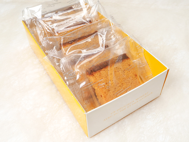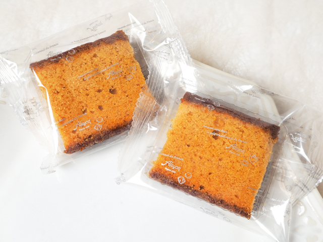 カステラ生地に、自家製キャラメルとフランス産カマルグ セルを加えてしっとり焼き上げた、人気の焼き菓子。下にザラメの層があり、ジャリっとした食感と甘みがアクセントを加えます。