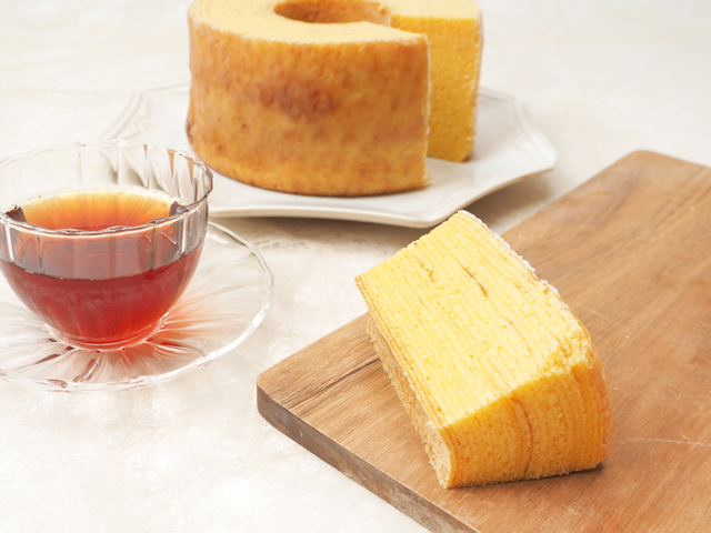 飲み物がなくても食べられると評判の「治一郎のバウムクーヘン」。ふわふわしっとりの食感は、薄くレアな層を丁寧に焼き重ねているからこそ。それ以上重ねると自重で落ちてしまう、絶妙なバランスで作り上げられます。