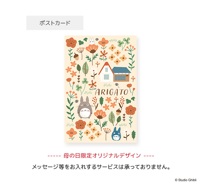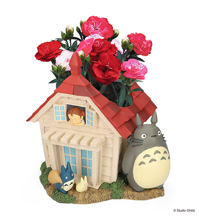 母の日にぴったりなアイテムもさっそく登場。「ジオラマボックス みんなの草壁家」は、「となりのトトロ」の世界を表現したプランターに、花びらが白から赤へ変わる不思議なカーネーション「マジカルチュチュ」(3.5号鉢)をセットした配送ギフト。メイとサツキの家と、その周りを駆け回るトトロたちをイメージした可愛いジオラマが特徴です。花色が変化するため、色んな楽しみ方ができます。お花の育て方カードや、母の日限定デザインのオリジナルメッセージカードも付属。専用の配送ボックスでお届けします。