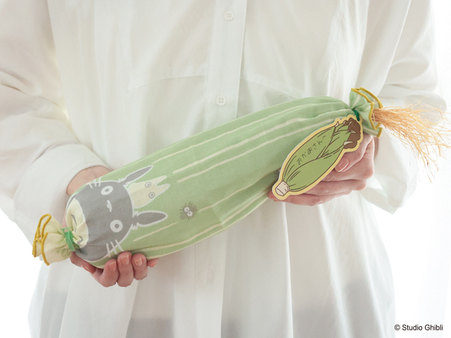 大判ガーゼハンカチは、とうもろこしの皮のようなストライプ模様。大トトロの上にちょこんと乗った小トトロがなんともかわいい1枚です。広げてみるとまっくろくろすけの姿も!シンプルながら、大判サイズなので使いやすいのも魅力。とうもろこしの皮のような傘袋に入れた傘をガーゼハンカチで包むようにしてお届けします。お母さんへの感謝を、作中でメイが一生懸命届けた「とうもろこし」に重ねてみてはいかがでしょうか。