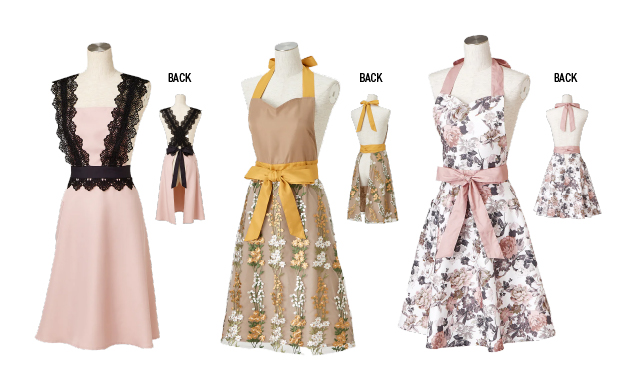 その他にも、左からレースフルエプロン(3,980円)、チュールフルエプロン(4,980円)、ダスティーフラワーコットンフルエプロン(3,980円)などを柄はさまざま。たくさんのデザインの中から、贈る相手に似合いそうな物を真心込めて探すのもプレゼント選びの楽しみの一つです♪