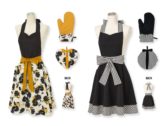 定番のボーダーをデザインしたストライプリボンフルエプロンも。こちらもミトンやポットホルダーと合わせて登場しています。どんなインテリアとも馴染みやすくおすすめです。