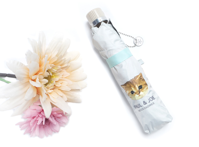 デザイナーであるソフィーの愛猫をプリントしたキュートな晴雨兼用日傘。つぶらな瞳と表情が可愛いヌネットは、ポール & ジョーのアイコン的な存在です。軽量で携帯しやすい折りたたみ傘で、手で傘の骨を折らなくてもワンタッチで広げられる簡単開閉タイプ。広げると無地のホワイトにヌネットがワンポイントでデザインされていて、シンプルな可愛さがたまりません。閉じた時はネームバンドがポップな差し色に。遮光率99.99%以上、UVカット99%以上で遮熱効果ありと機能面もばっちり。