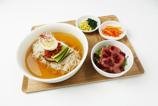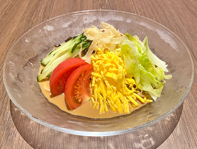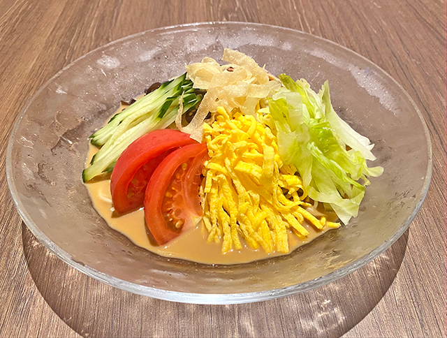 暑い季節には特製冷麺もおすすめ。きゅうりやレタス、トマトなど涼し気な夏野菜がたっぷり。味付けはごまダレと醤油ダレの2種類。9月中旬頃までの季節限定メニューなので、夏のおいしさを逃さず楽しんで♪