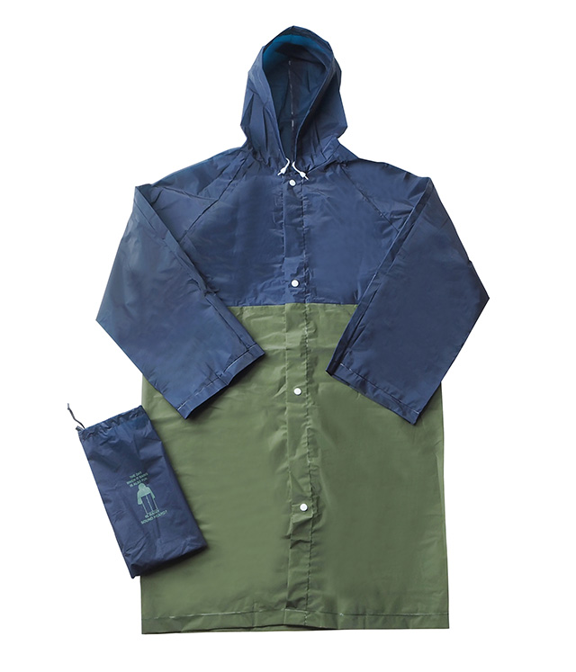 こちらはカラーの切り替えがおしゃれな簡易レインコート。男女で兼用できるシンプルなデザイン。持ち歩きやすい巾着付きで、ちょっとした雨の日の備えにぴったりのアイテムです。