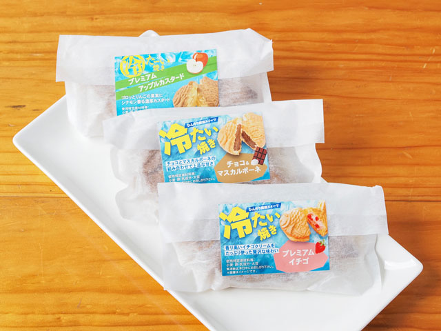 「プレミアムイチゴ」は香り高いいちごクリームをたっぷり使った贅沢な味わい。チョコとマスカルポーネの組み合わせは、上品な甘さで暑い日にも◎。小腹がすいた時は冷たい焼きでホッとひんやりしてください♪