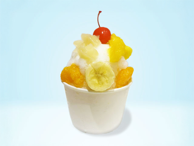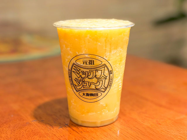 「ミックスジュース」は開店当時からの看板メニュー。温州みかんの爽やかな酸味と黄桃やバナナの濃厚な風味が相性抜群。Sサイズはコップからあふれそうなほどたっぷり♪シャリシャリ食感とさっぱりした後味は、改良を重ねつつも守り抜いてきた名店の味です。