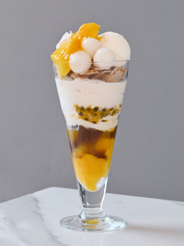 マンゴーの甘さとパッションフルーツの酸味がベストマッチなパフェにも注目♪ココナッツアイスに、シナモンやクローブなどのスパイス香るオリジナルチャイゼリーをトッピングした南国を感じられる味わいです。甘すぎずさっぱりした後味で暑い夏にぴったり◎