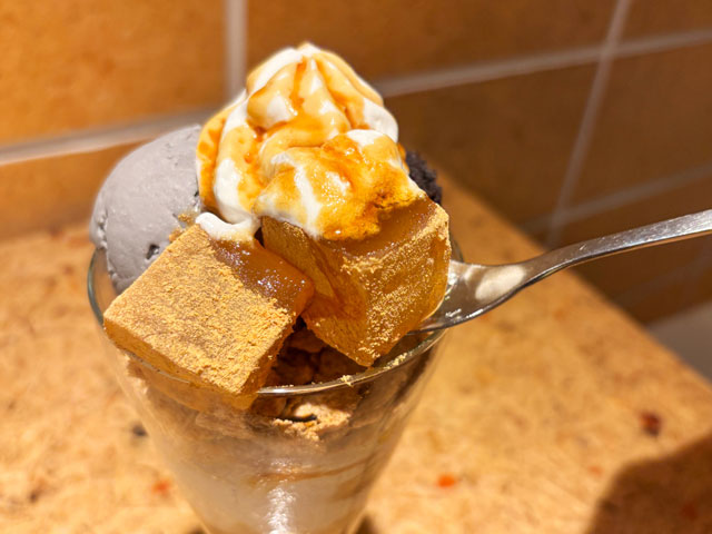 ヘルシーな寒天と相性抜群の黒蜜に、ソフトクリームや黒胡麻アイス、黒胡麻あんこをトッピング。本わらび餅粉を使用した格式高いわらび餅も楽しめます。