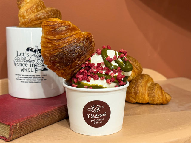 ピスタチオソースとラズベリーがベストマッチなソフトクリームもイチオシのメニュー。熱々でサクサクのクロワッサンを追加すればさらにおいしく、一瞬でトリコに!