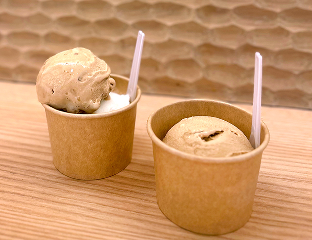 ロールアイスは、マイナス10℃以下に冷やしたコールドプレートでくるくる巻いて仕上げる新感覚アイス。新メニューの「キャラメルモカファッジ」は、バターサブレの塩味とキャラメルクランチの食感が良いアクセント。甘すぎず夏でも食べやすいですよ♪