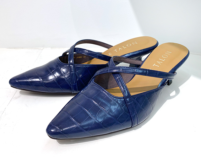 型押しの素材感とヒールの形がトレンド感のあるレトロなミュール。まだまだ暑い初秋にもさっと履きやすく、この時期おすすめな1足です。太めのアワーグラスシルエットのヒールは、見た目より安定感のある履き心地。クロス部分が深めの位置で甲を抑えてくれるから、ミュールでも比較的脱げにくいのも嬉しいポイントです。