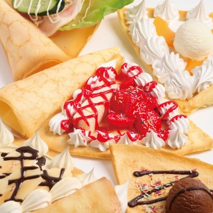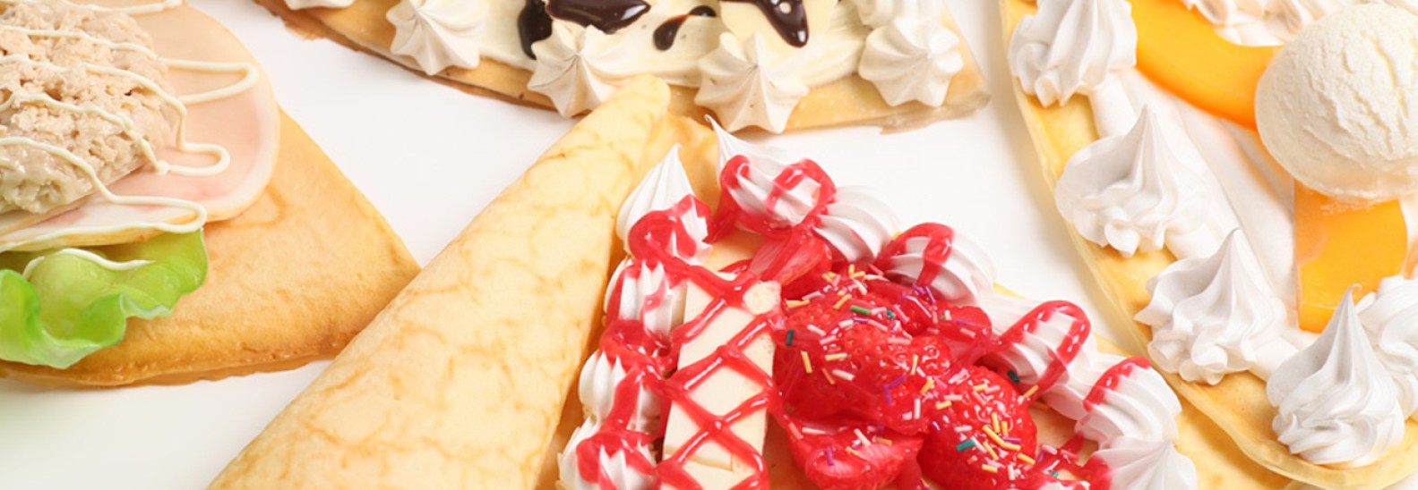 クレープを中心にソフトクリームやタピオカドリンクなど多彩なメニューが並びます。「サクマ製菓」とコラボしたスイーツ・スナックも必見!